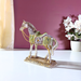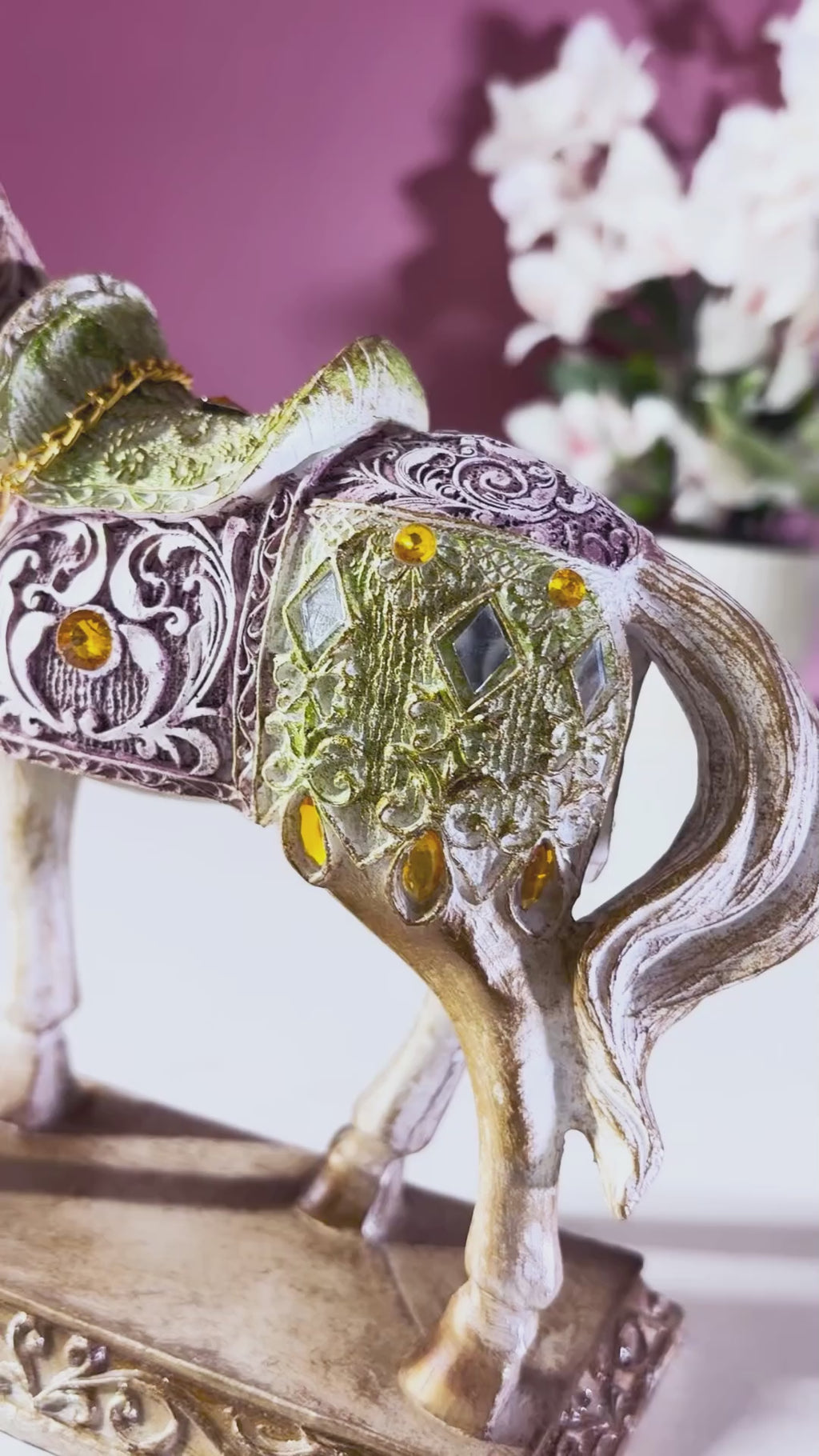 The intricate embossed patterns and fine gold chain bridle reimagine the royal pageantry of India’s grand Mughal processions. Command attention on console tables, bookshelves, office desks, or foyer vignettes—especially against contemporary or ethnic interiors. In Vastu, a standing horse signals fame, harmony, and forward movement, making it an auspicious accent.