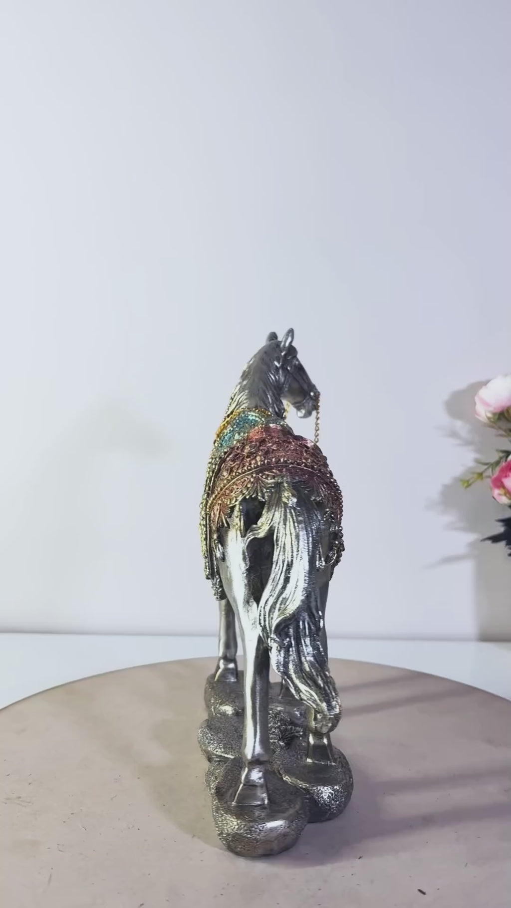 Elevate your décor with the Regal Steed of Rajasthan, a breathtaking polyresin sculpture by The Decor Paradise. Rising 24 cm tall with a 20 cm length and 7 cm width, this majestic horse captures motion and grandeur in stunning detail. Expertly cast from premium polyresin and hand-finished in brushed silver, its ornate Rajasthani saddle is adorned with jewel-tone teal, ruby, and antique gold accents.