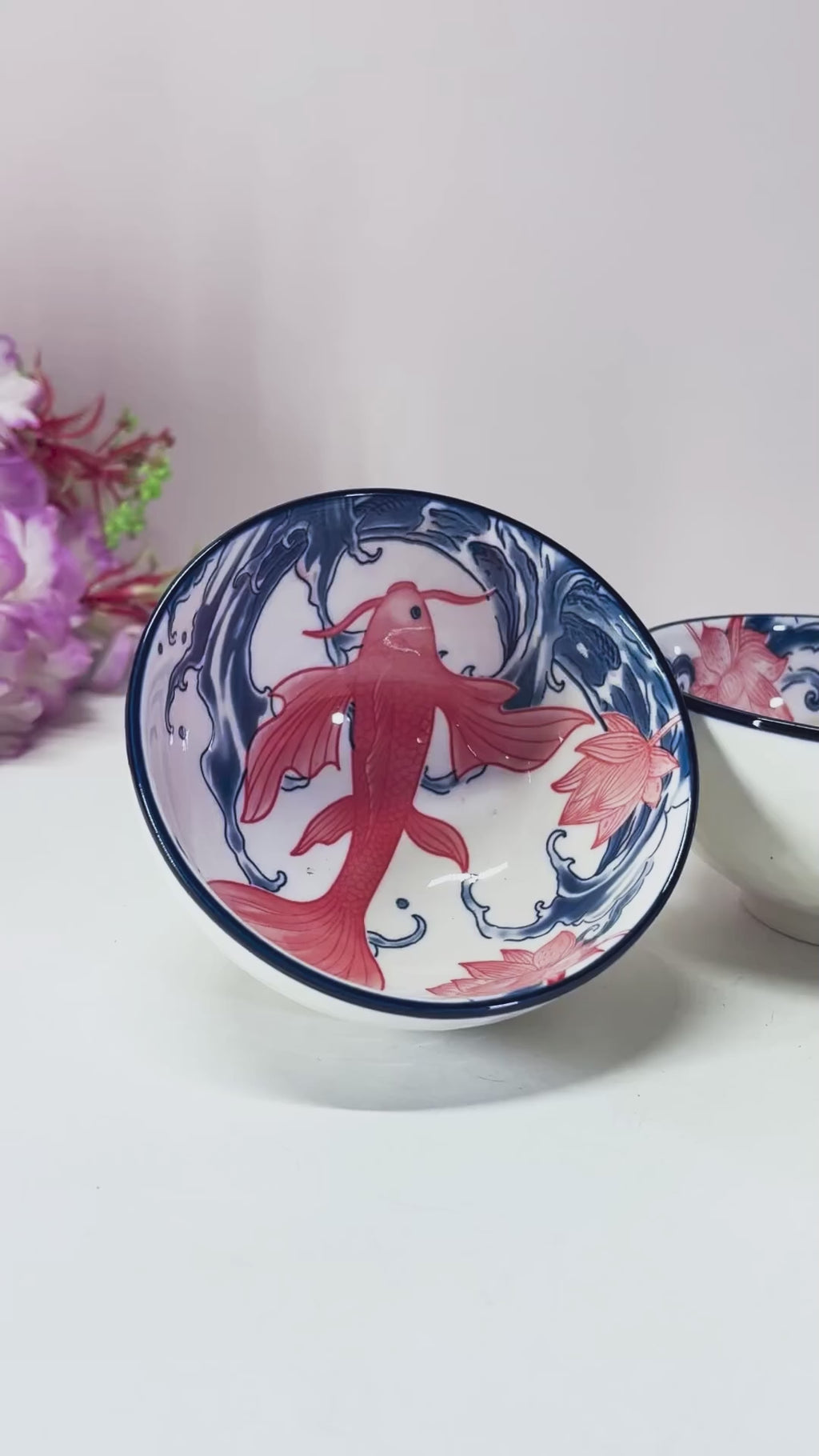 Transform your dining experience with this exquisite Japanese Koi Lotus Ceramic Bowl Set from The Decor Paradise. Each bowl features intricate hand-painted red koi fish gracefully swimming through flowing blue waves, adorned with delicate lotus blossoms—symbols of prosperity, good fortune, and tranquility in Asian culture.