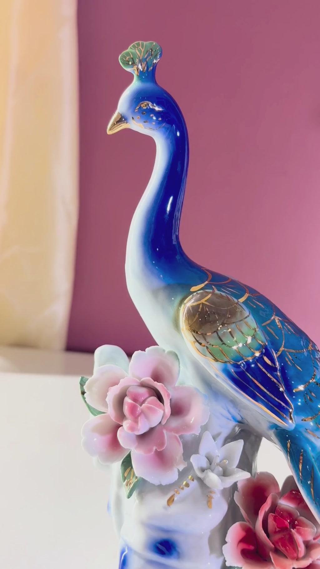 Each feather is hand-painted with gold accents and ruby-red “eyes,” capturing the bird’s regal elegance. The ornate ceramic floral base, adorned with coral-pink blossoms and delicate white blooms, evokes a serene garden tableau. Perfect for living room consoles, entryway tables, office reception desks, or bedroom dressers, this statement piece brings a burst of colour and positive energy. In Vastu Shastra, peacocks symbolize beauty, prosperity, and protection, making this sculpture an auspicious addition to any home.