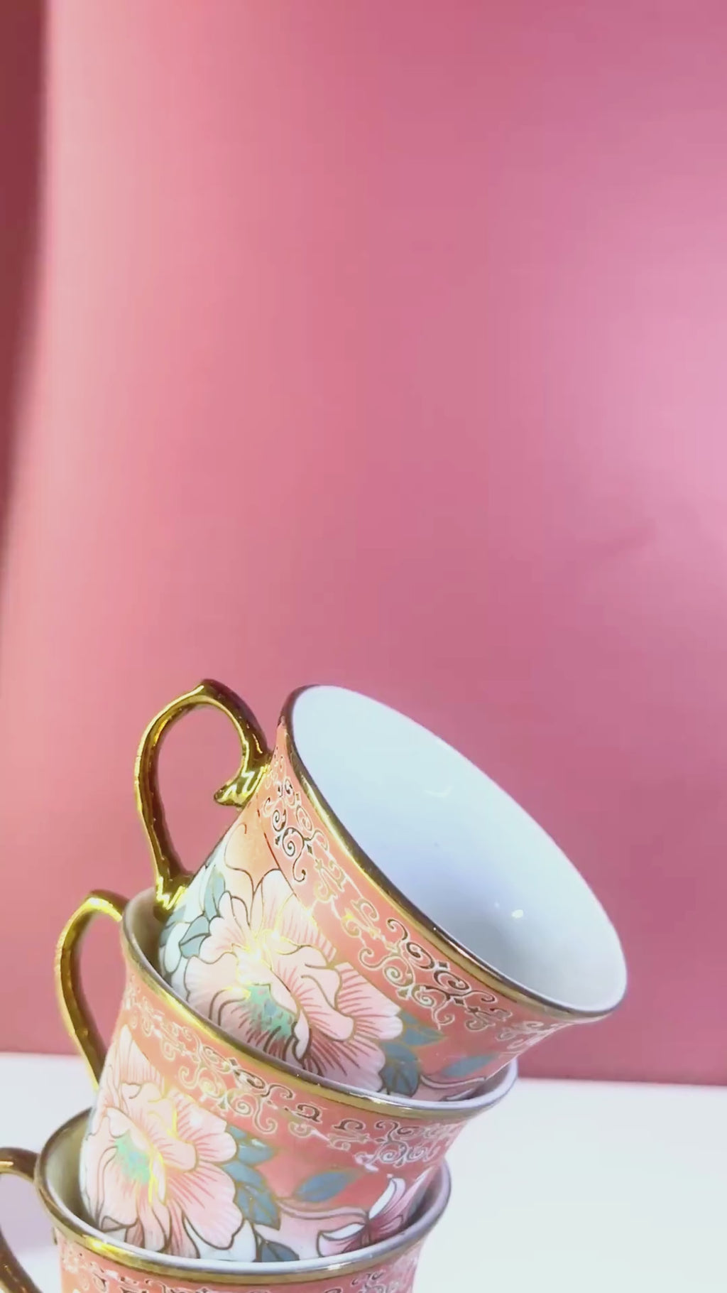 Coral Blossom Gold-Trim Ceramic Tea Cup & Saucer Set – 12 Pieces