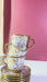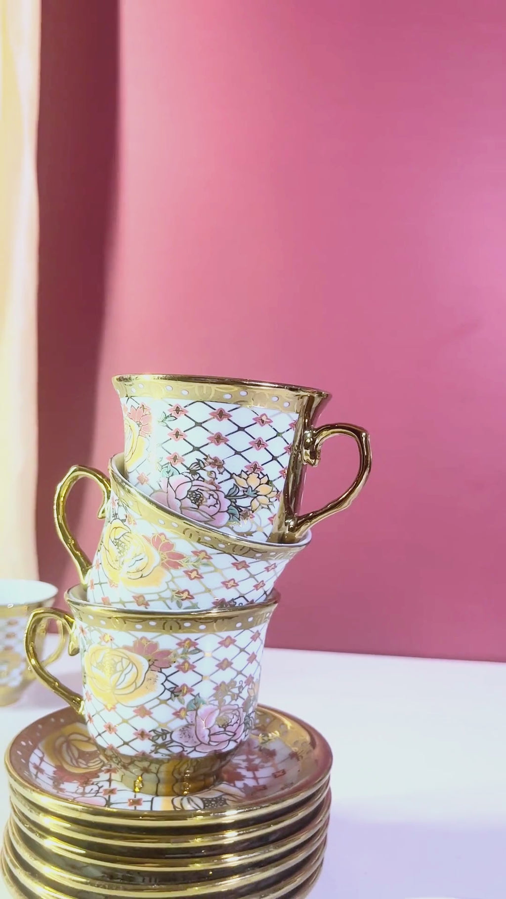 The captivating lattice motif is enhanced by delicate floral accents in soft pastels, creating a perfect harmony between classic elegance and contemporary style. Each piece is meticulously finished with lustrous gold rims and handles, adding a touch of opulence that transforms every tea moment into a royal experience.