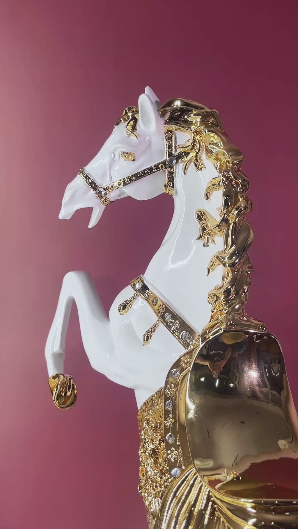 Transform your living space with The Decor Paradise's Premium White & Gold Rearing Horse Statue – a masterpiece of elegance and strength. This magnificent 66 cm tall figurine captures a powerful stallion in a dynamic rearing pose, symbolizing success, freedom, and forward momentum. Crafted from premium polyresin with intricate detailing, the pristine white body contrasts beautifully with luxurious gold-finish accents on the mane, saddle, and base elements.