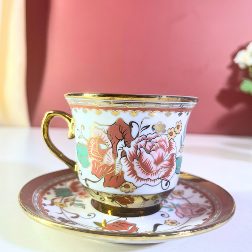 View full detailsCoral Blossom Gold-Trim Ceramic Tea Cup & Saucer Set – 12 Pieces